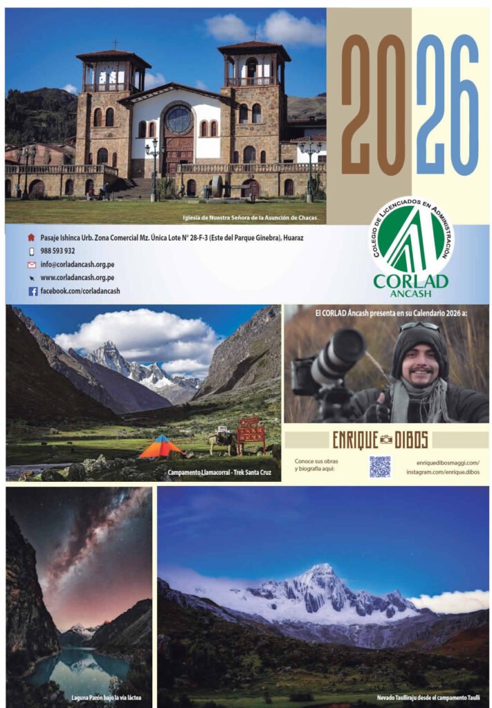 El Colegio de Licenciados en Administración de Áncash (CORLAD Áncash) agradece profundamente la gentileza de Enrique Dibos Maggi por ceder el uso de sus fotografías de la galería Cordillera Blanca para la elaboración del Calendario 2026. Esta colaboración permite que la comunidad profesional de administradores de Áncash pueda apreciar y compartir durante todo el año la belleza de nuestra región, capturada con el talento y la sensibilidad artística de este destacado fotógrafo.